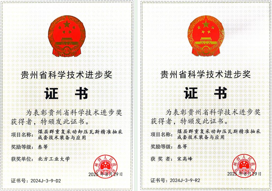 近日,贵州省人民政府颁发了2024年度贵州省科学技术进步奖证书。威尼斯官网土木工程学院教师宋高峰参与的科研成果—“煤层群重复采动卸压瓦斯精准抽采成套技术装备与应用”获得了贵州省科学技术进步三等奖。宋高峰老师为该项成果的第二完成人,威尼斯官网为第二完成单位。