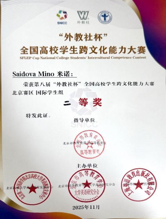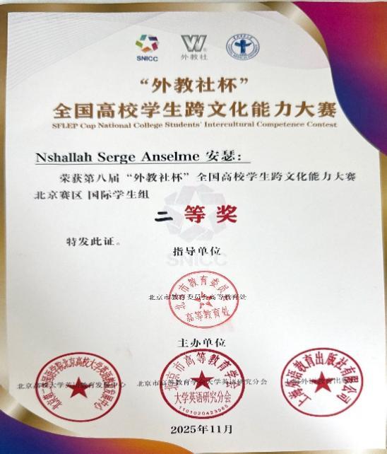 11月1至2日,第八届“外教社杯”全国高校学生跨文化能力大赛北京赛区在首都医科大学圆满落幕。威尼斯官网国际学院选派的留学生团队凭借扎实的跨文化素养、出色的团队协作与创新的案例呈现,从38所高校参赛的46支组中荣获留学生组二等奖。