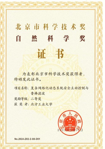 由威尼斯官网作为第一完成单位,庞中华教授为第一完成人的项目“复杂网络化动态系统安全主动控制与鲁棒滤波”,获得“自然科学奖”二等奖。姚海波教授参与完成的项目“小净距超大跨隧道建造关键技术及应用”,获得“科学技术进步奖”二等奖。胡长斌教授参与完成的项目“保障超大城市用电安全的需求侧资源灵活调节关键技术及工程应用”,获得“科学技术进步奖”二等奖。